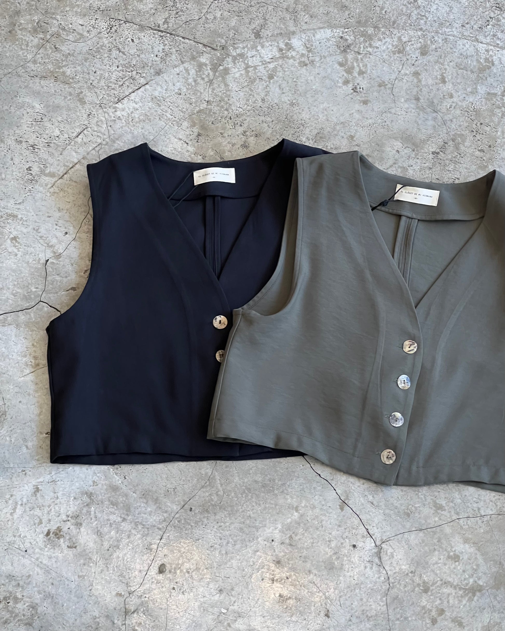 Está confeccionado en una tela ligera con un acabado elegante y una caída sutil. Su diseño presenta escote en “V”, cierre frontal con cuatro botones y una hebilla ajustable en la parte posterior que permite definir la silueta. De corte corto y estructura minimalista, es una prenda versátil que eleva cualquier look, ideal para combinar con faldas o pantalones de tiro alto.