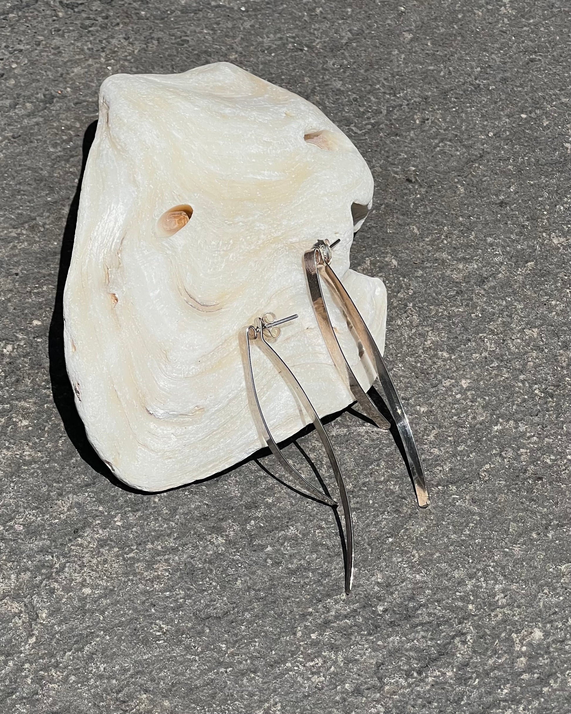 Diseñados con líneas limpias y un movimiento sutil, estos aretes de plata 925 destacan por su forma alargada y curvada que estiliza el rostro. Su acabado pulido refleja la luz con delicadeza, aportando un toque moderno y sofisticado a cualquier look.