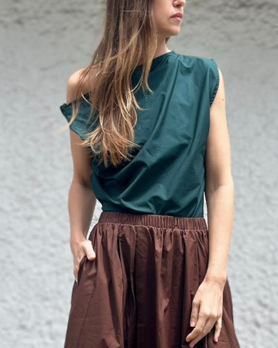 El Top Martine es una pieza elegante y minimalista que destaca por su diseño asimétrico. Un lado presenta un delicado drapeado que simula un nudo, mientras que el otro mantiene una línea recta que equilibra la silueta.