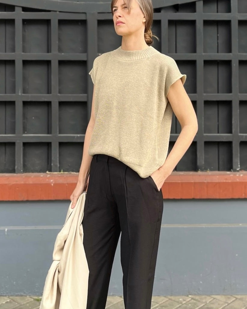 Top tejido con cuello cerrado y manga murciélago. Una pieza atemporal debido a su silueta cómoda y colores neutros. Combínalo con nuestro pantalón JAN.